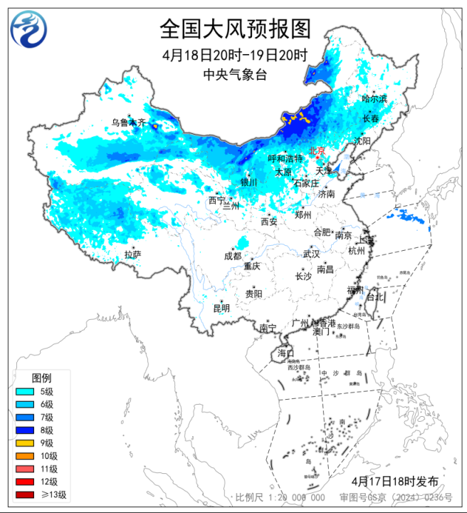 预计,4月17日20时至18日20时,新疆大部、内蒙古大部、西藏北部、青海西部和北部、甘肃北部、宁夏中北部、陕西北部、黑龙江中南部等地部分地区有5~7级风,阵风8~9级,其中新疆东北部、内蒙古中西部局地有8~9级风,阵风10级以上。