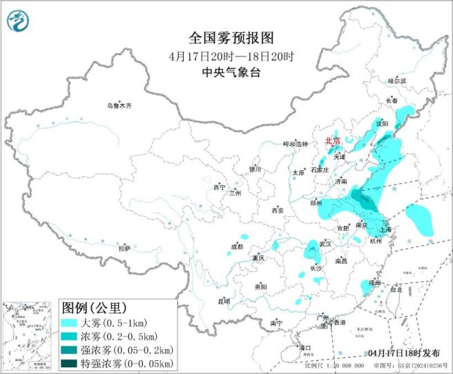中央气象台4月17日18时继续发布大雾黄色预警:
